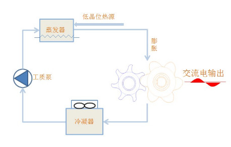 基于有機郎肯循環(huán)(Organic Rankine Cycle簡稱ORC)原理,利用低品位熱源產(chǎn)生動力:通過低沸點有機工質獲取其他介質的熱能,轉化為壓力能,通過膨脹機將壓力能轉化為機械能,最終通過發(fā)電機將機械能轉化為電能。